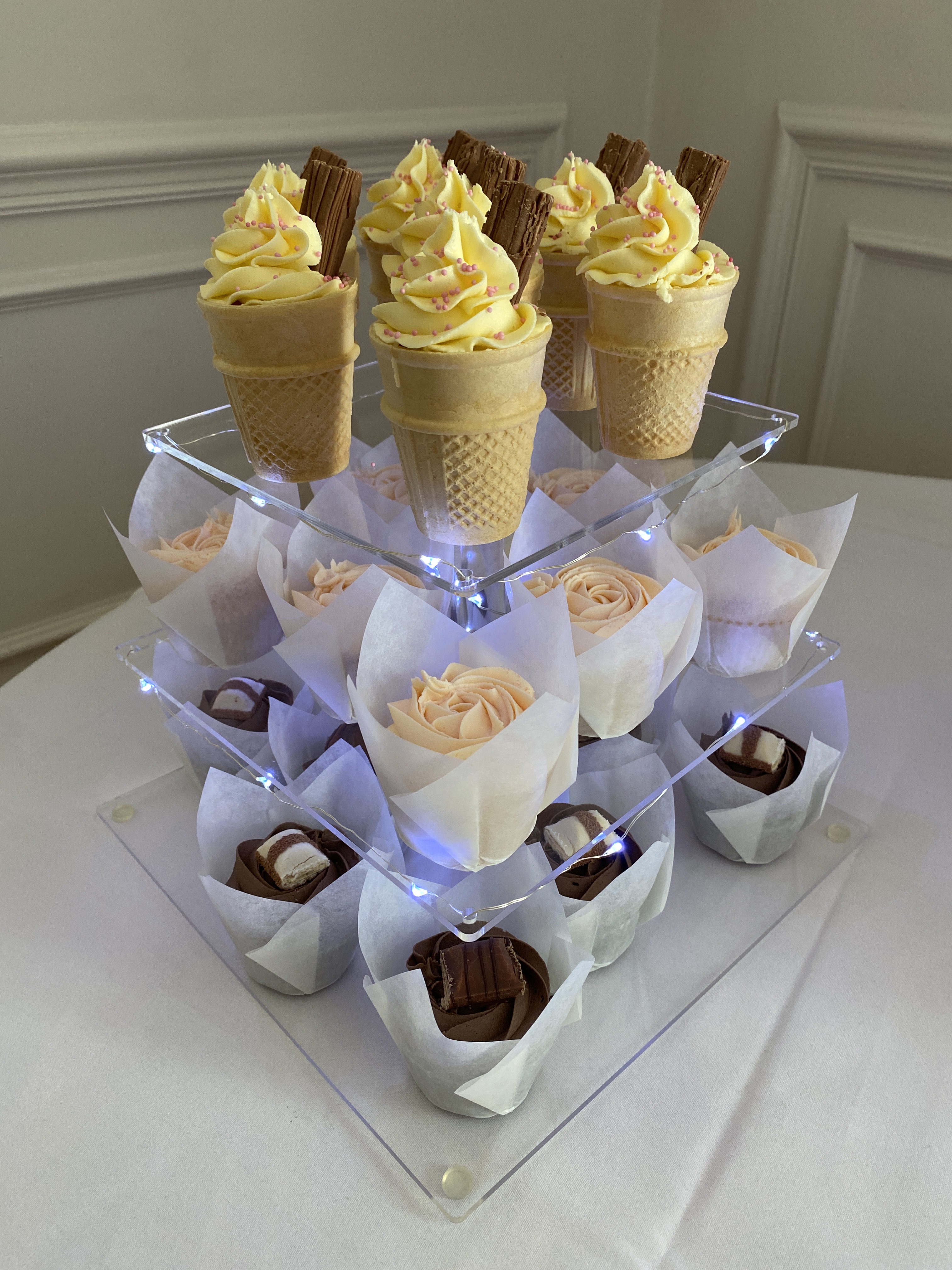 We have two battery-operated light-up acrylic square stands available to hire. They can be assembled with two, three or four tiers, making them flexible for a variety of options.
