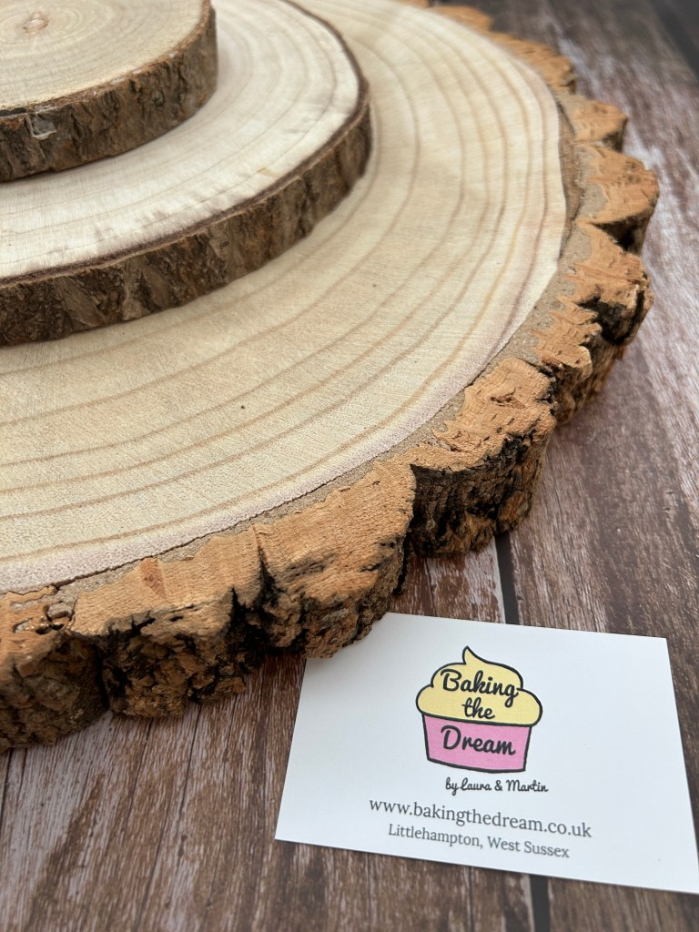 Popular for displaying special celebration cakes and wedding cakes, we have a range of wooden log slice cake stands available in a variety of sizes.