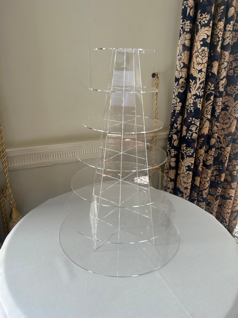 Our seven-tiered circular acrylic stand is suitable for displaying cupcakes and/or mini cupcakes. It can also be assembled with a fewer number of tiers.