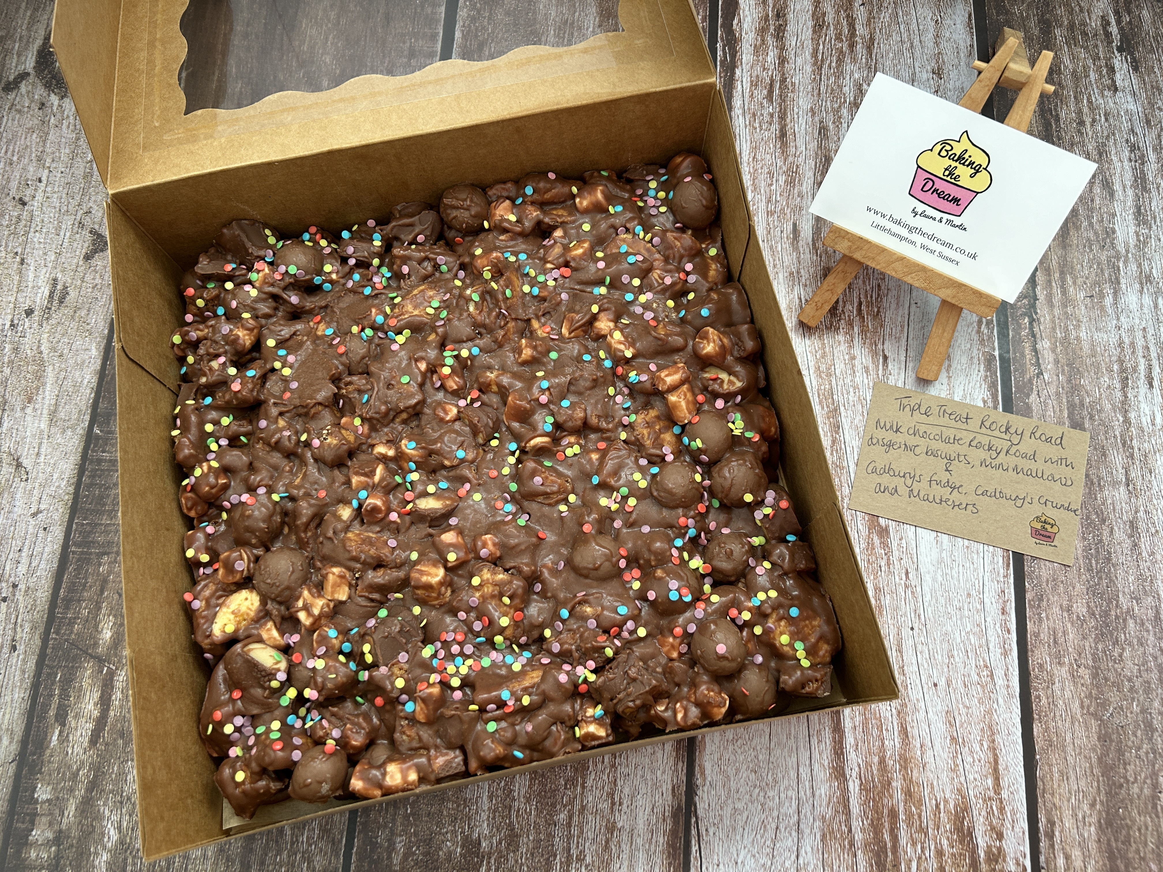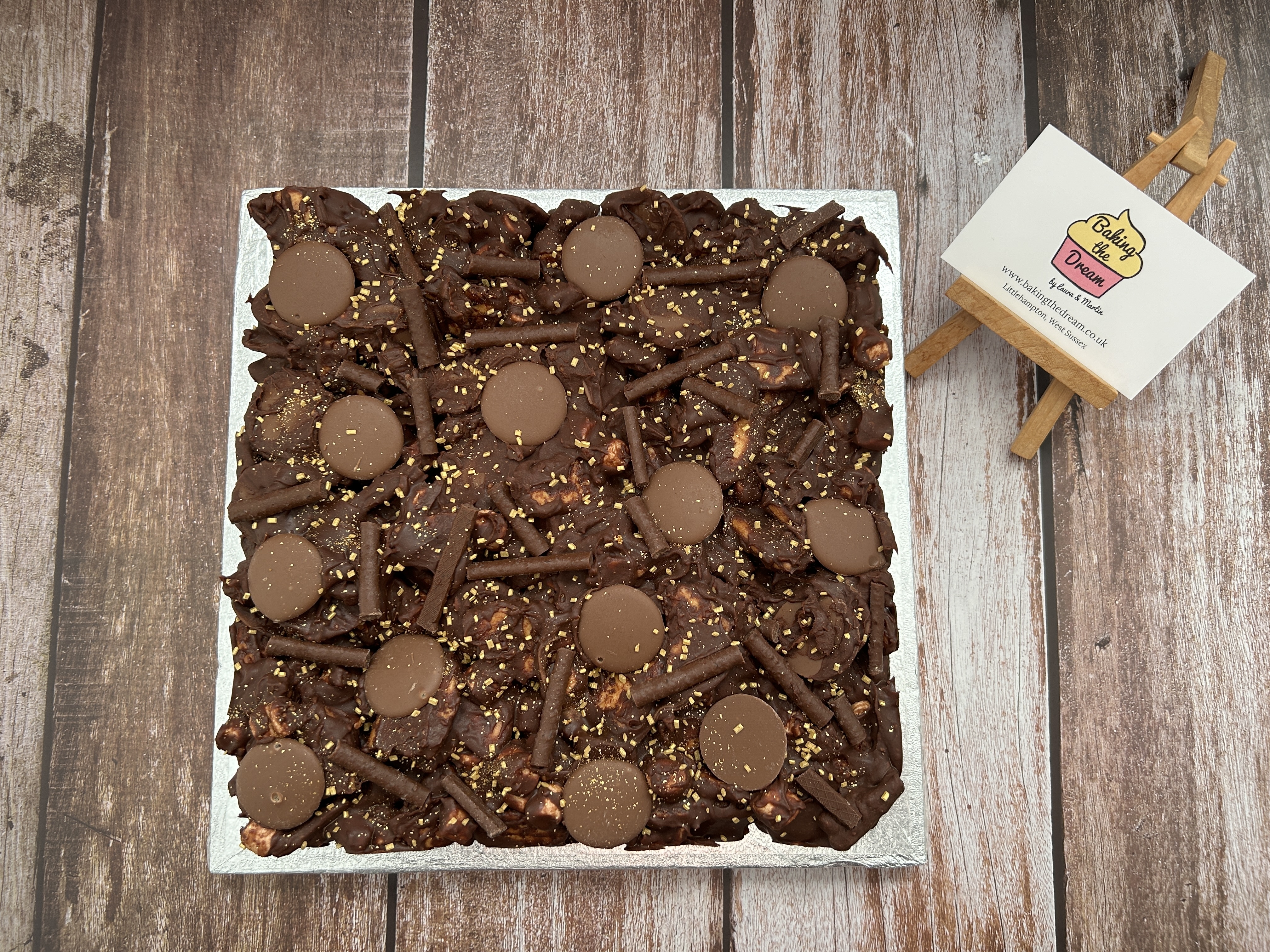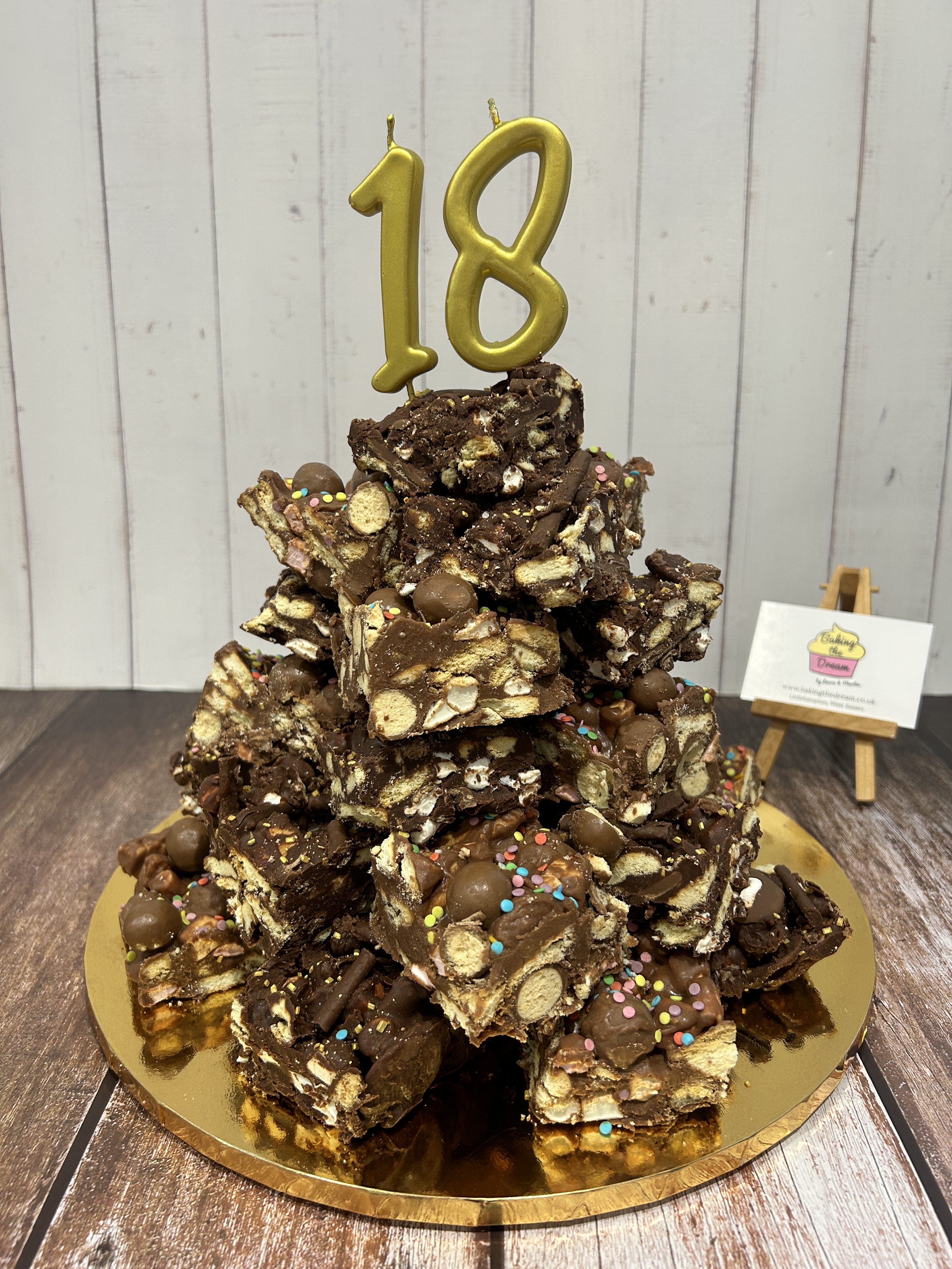 For Β£55, we create your Rocky Road Tower with two slabs of Rocky Road, presented on a luxury gold mirrored board (other colours possible by request) and safely contained within a tall box.