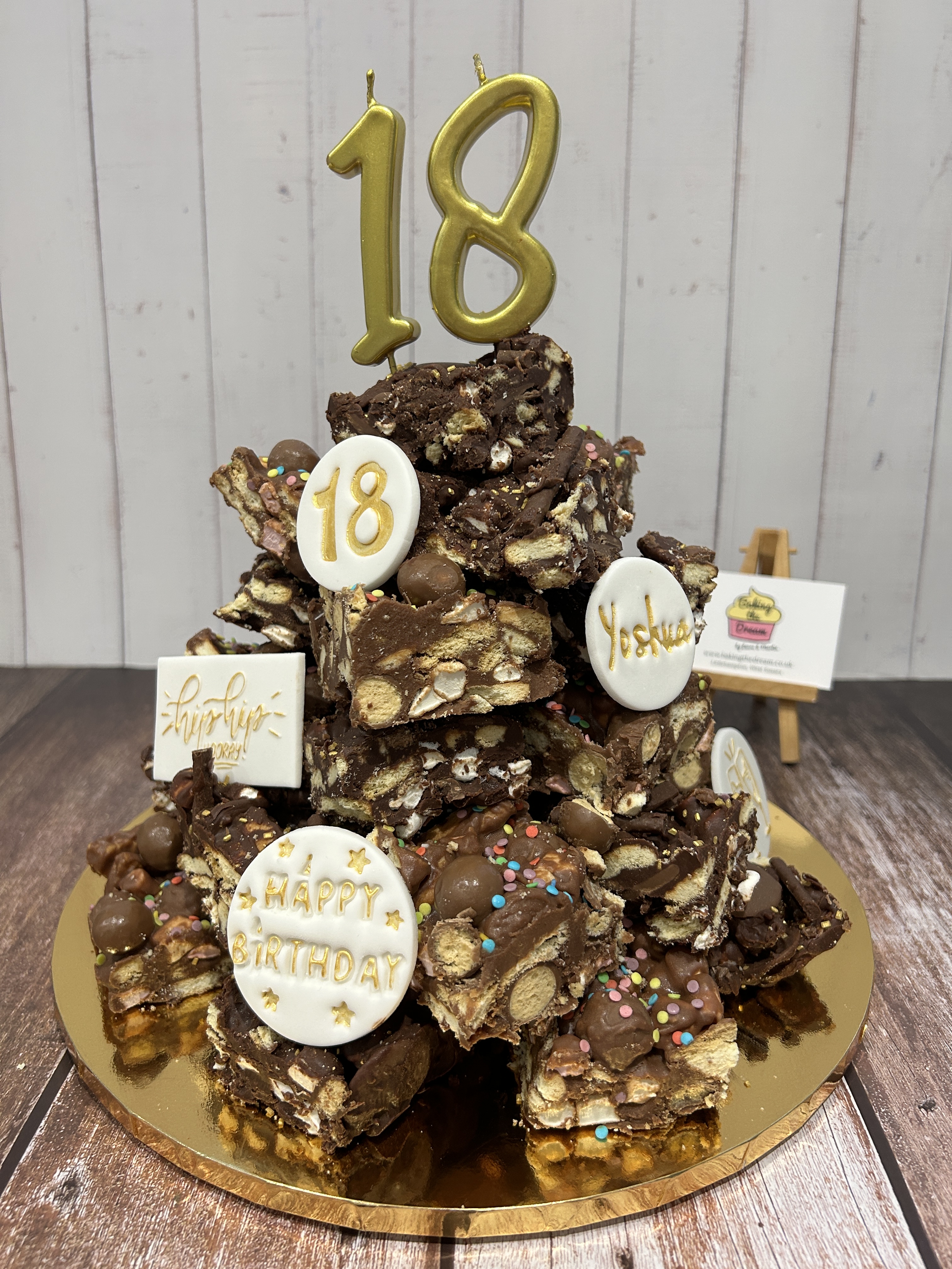 We can also decorate your Rocky Road Tower with other personalised or themed details – these start from Β£10 for printed card details or from Β£15 for handcrafted edible sugarpaste details.